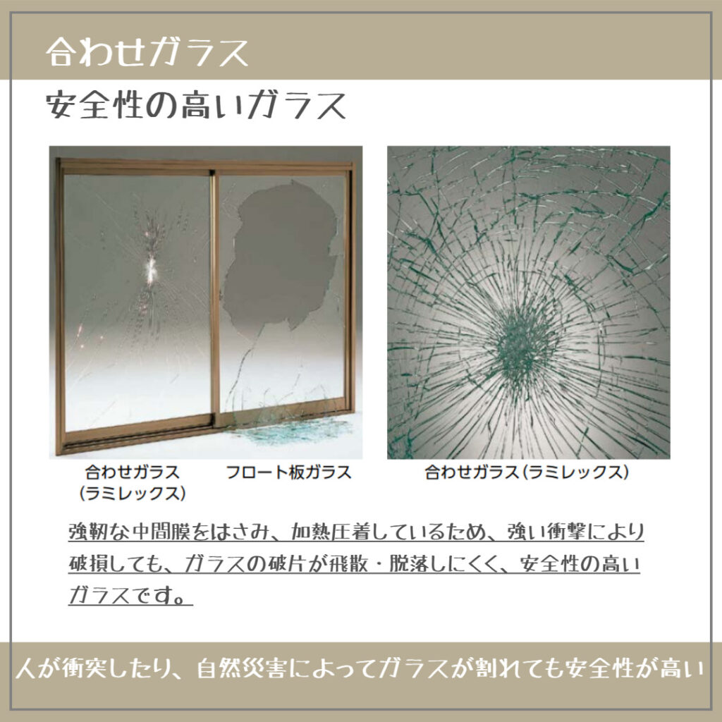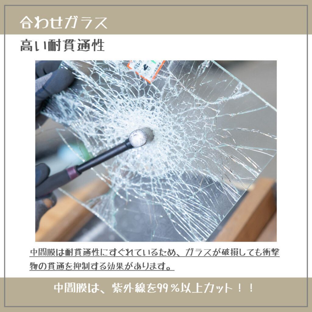 - 強い衝撃を受けてガラスが破損してもガラス破片が飛散しにくく、安全性にすぐれている