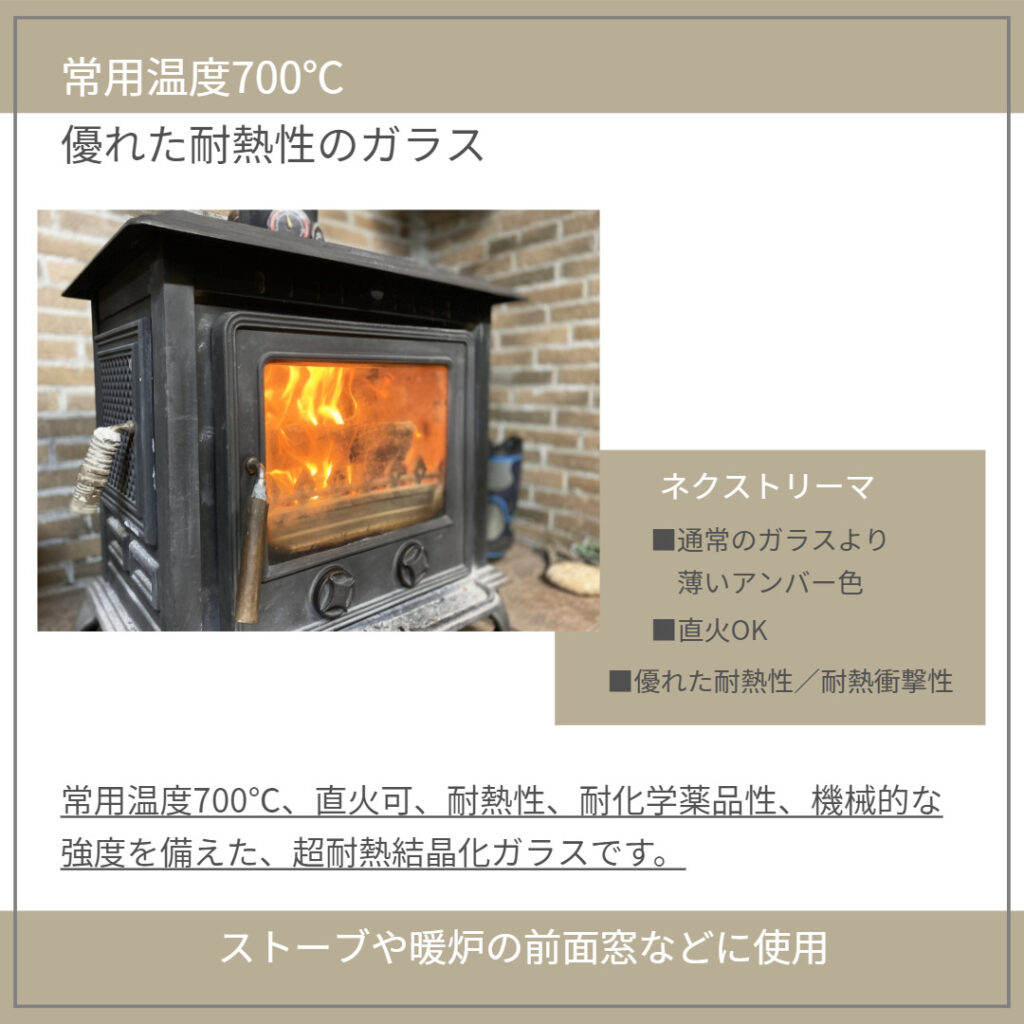 さらに、このような高温環境下で使用する場合、繰り返しの加熱や冷却による劣化を防ぐための耐熱性も重要です。この素材であれば、過酷な条件下でも性能が低下することなく、安定した状態を維持できます。これらの特性から、高い耐熱性を持つガラス素材は、薪ストーブの窓ガラスとして最適です。