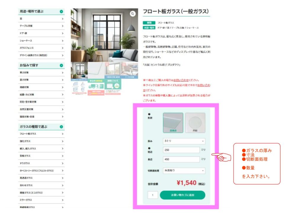 ②フロート板ガラス(ピンク色の枠内部分)をクリックします。