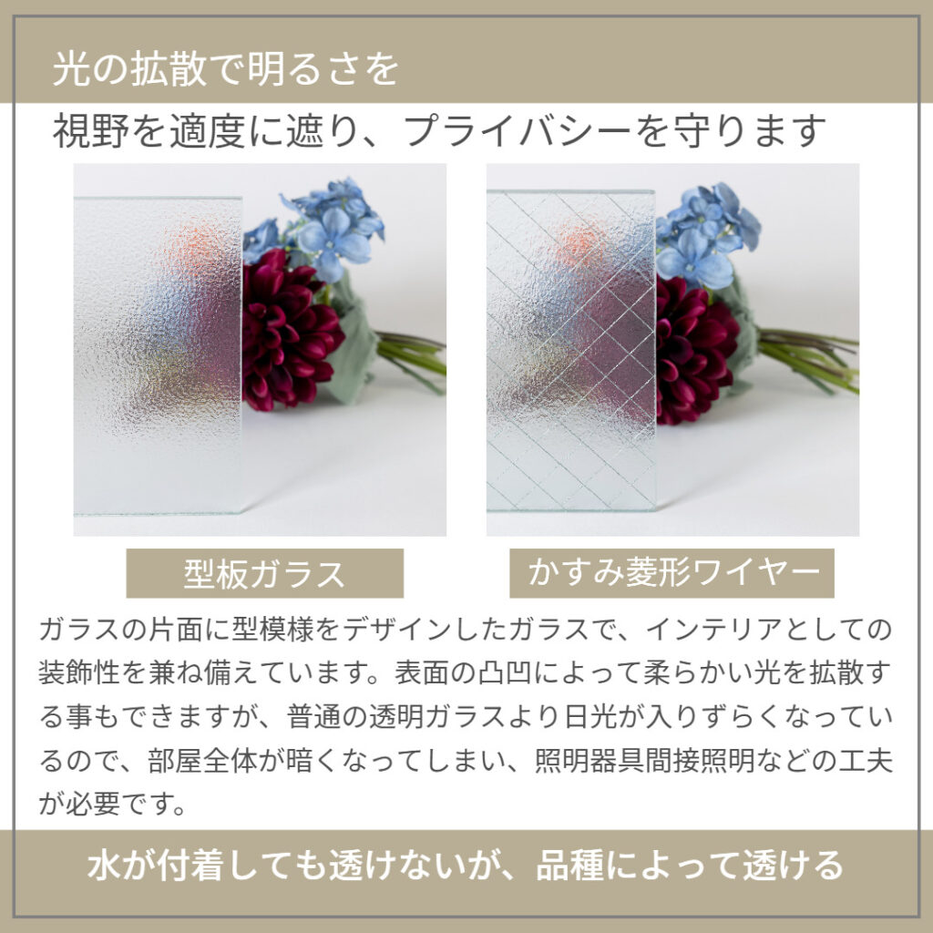 型板ガラス、すりガラス、フロストガラス・・どれも透明でないガラスですが、柄の違いなど紹介しています。参考にしてもらえると嬉しいです♪(画像をクリック☝)