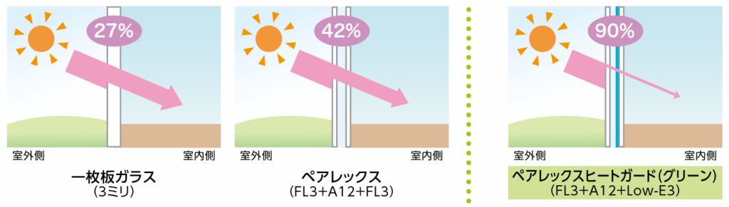 なので、室内側にある物の変色や退色を抑制したいときにおススメのガラスです。