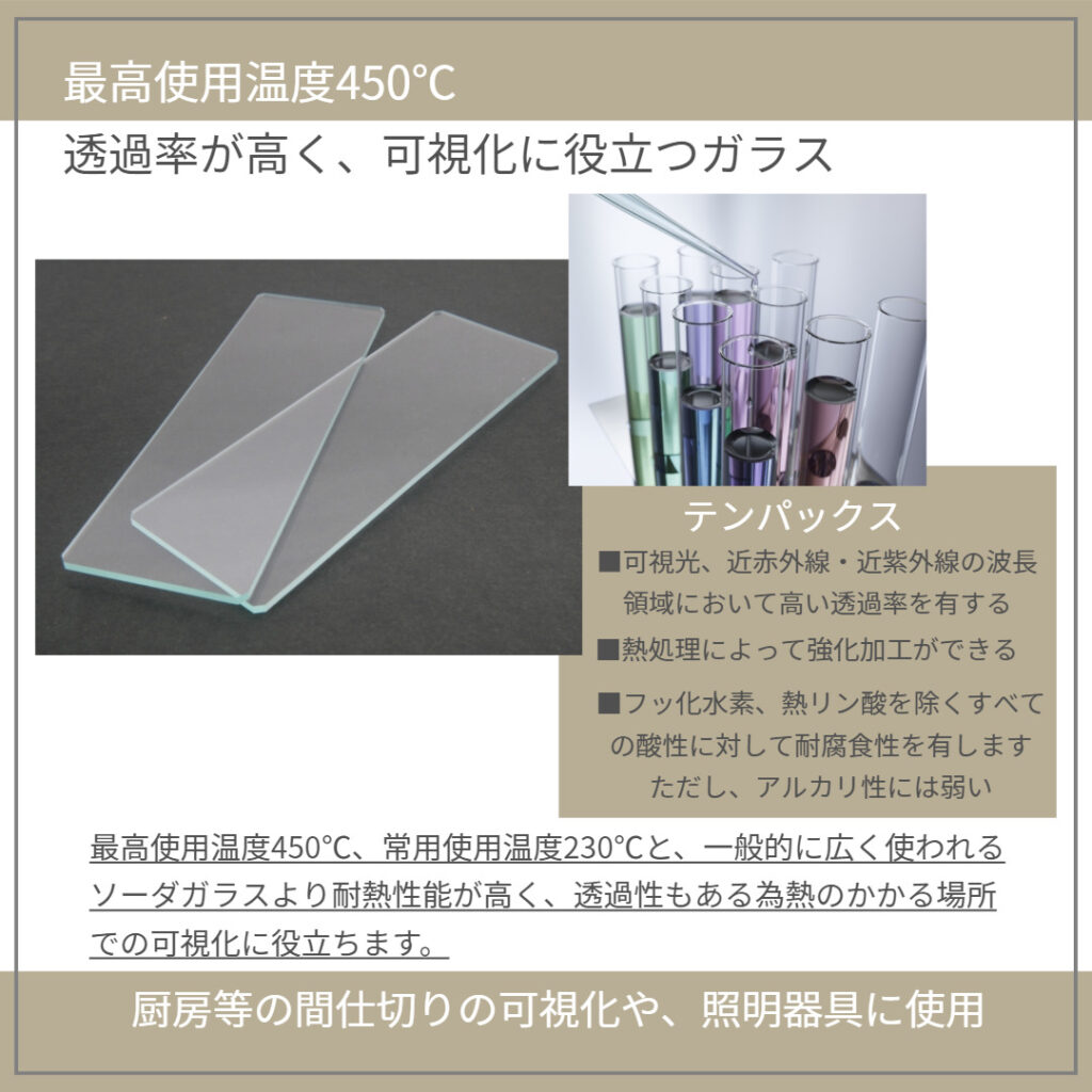 テンパックスは、耐熱性に優れたガラスで、500℃までの高温に耐えられるため、加熱機器の窓や実験器具などに使用されます。
