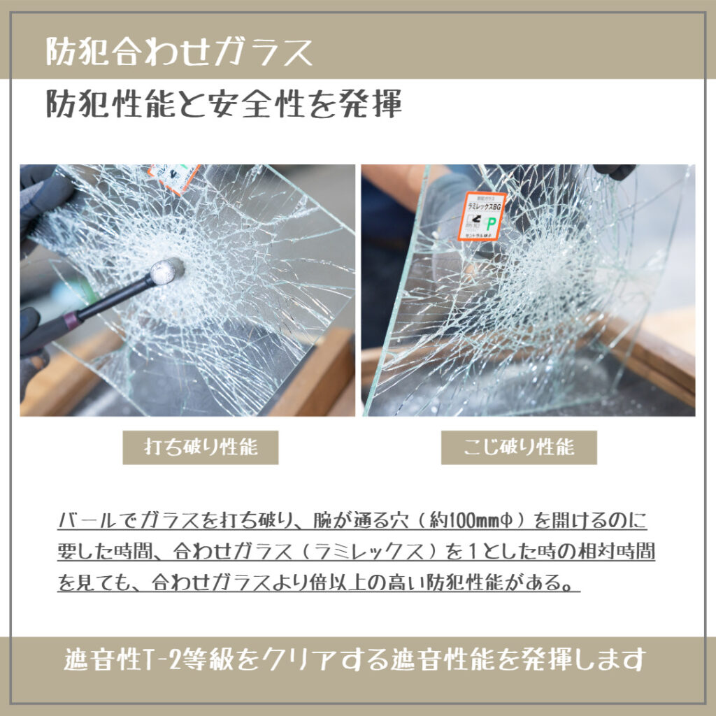 防犯ガラスに使用している特殊樹脂膜により耐貫通性にすぐれ、防犯性能を発揮します。