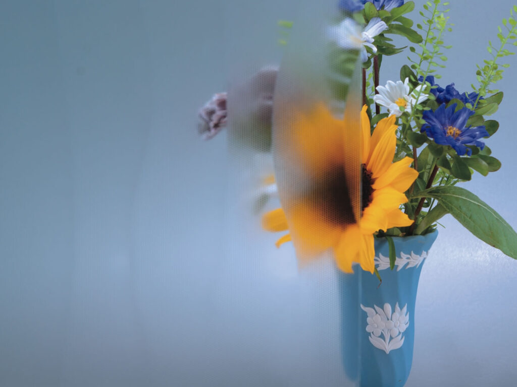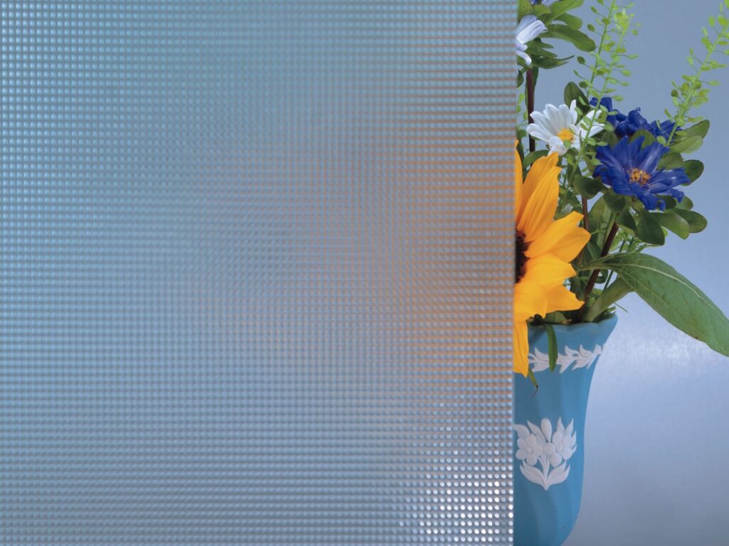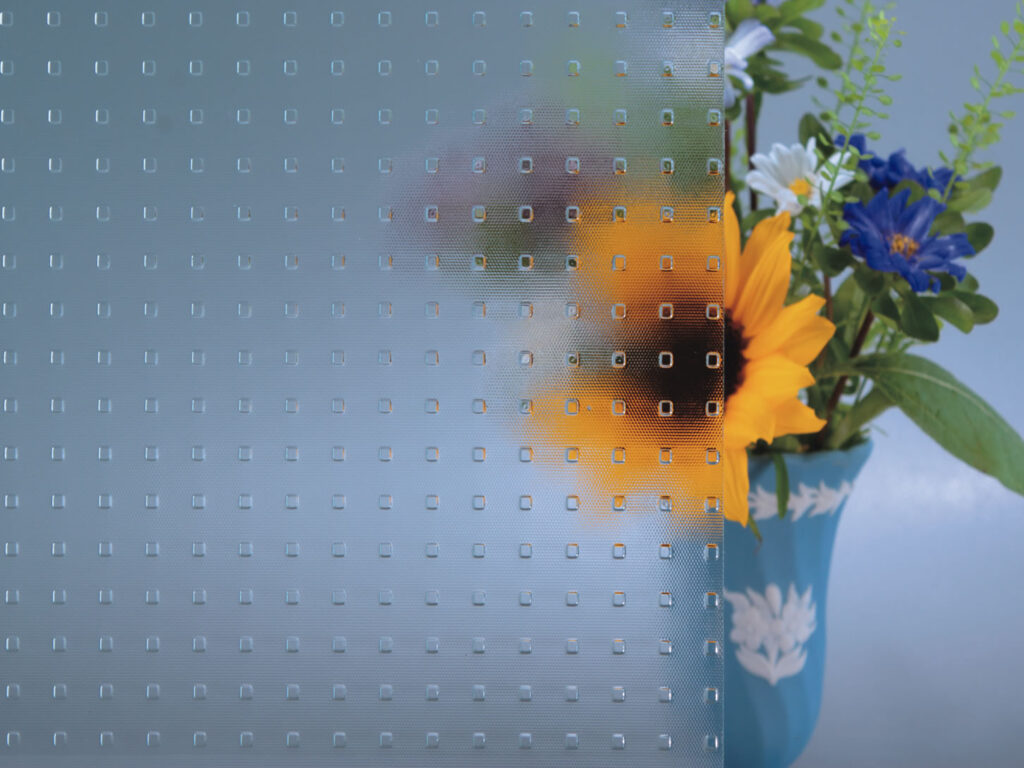 ドットが規則正しく正方形に並んでいる、デザインのガラスです。