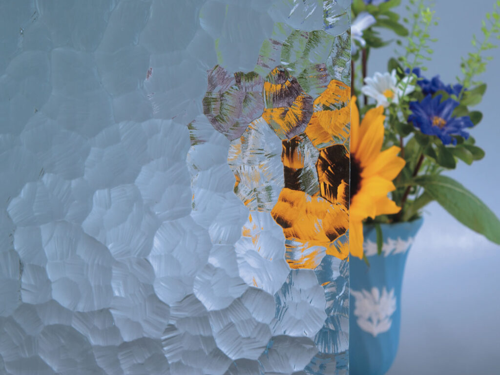 細かい梨地状に槌目が付けられているデザインのガラスです。