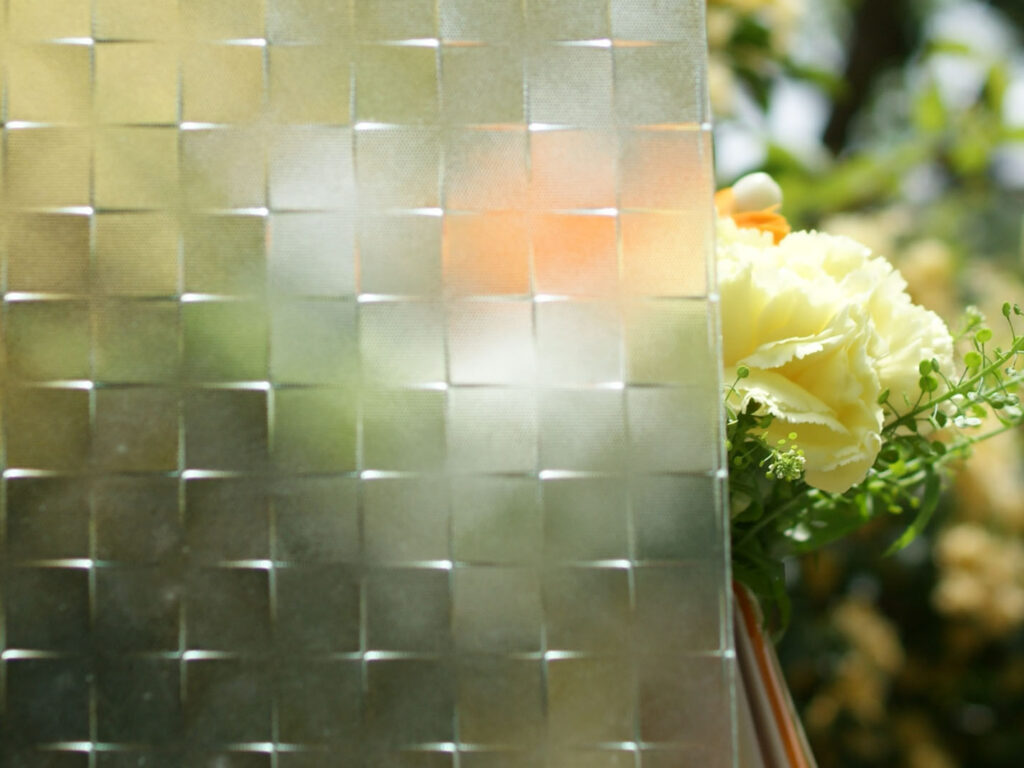 小さな正方形の模様が等間隔に並んでいるデザインのガラスです。