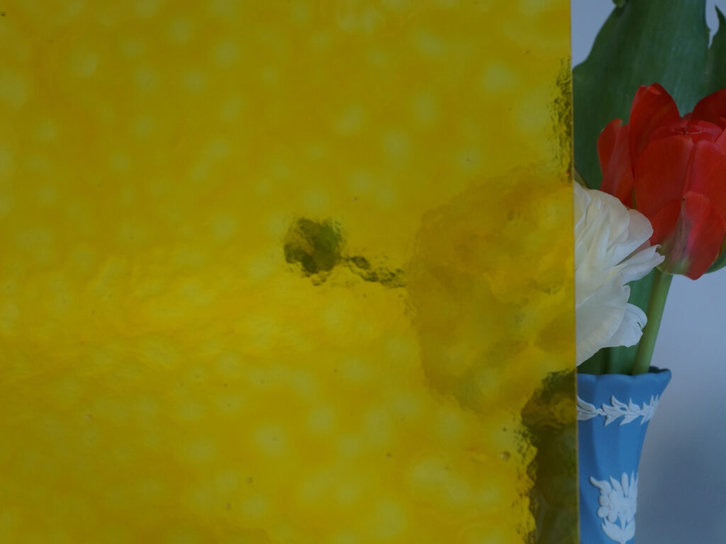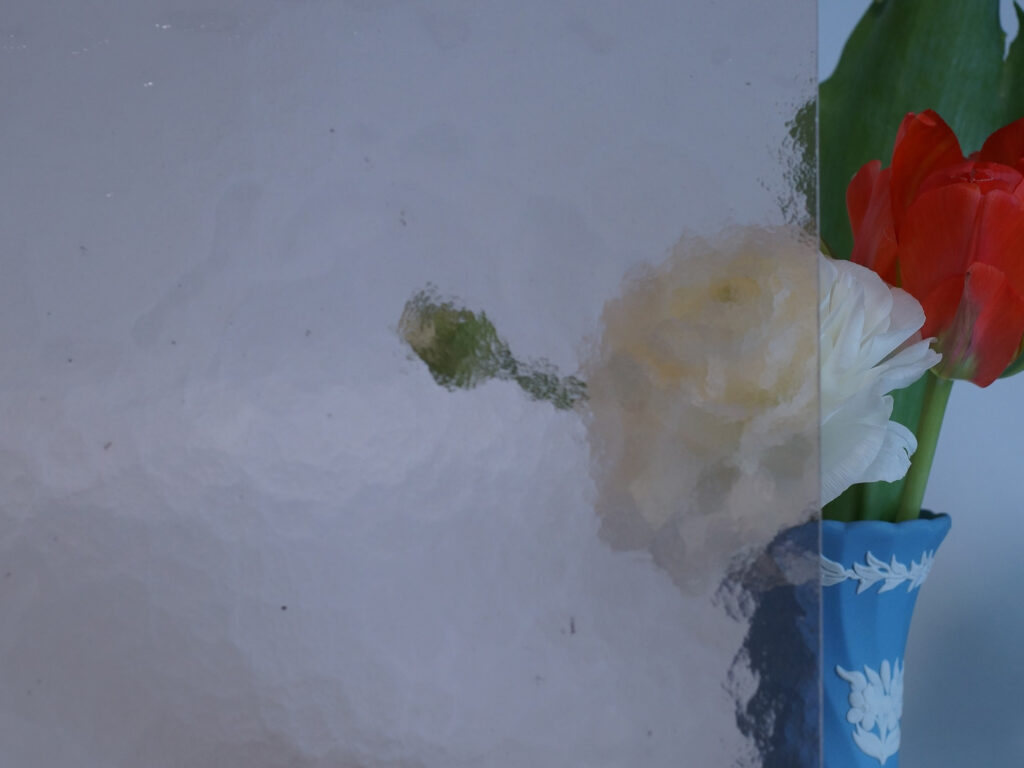 熔解炉から熔けたガラスを柄杓で汲み出し、ローラーを備えた延ばし台(テーブル)の上で職人が1枚1枚板状に作る、伝統的な製法のガラスです。