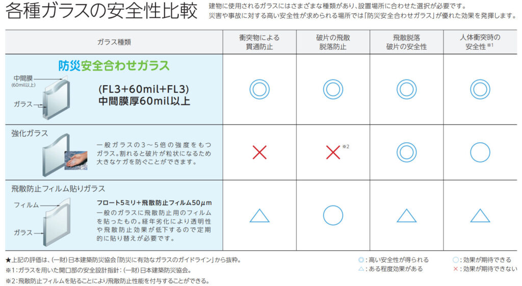 2枚の板ガラスの間に挟んでいる中間膜が60mil以上のものを、「防災安全合わせガラス」といいます。